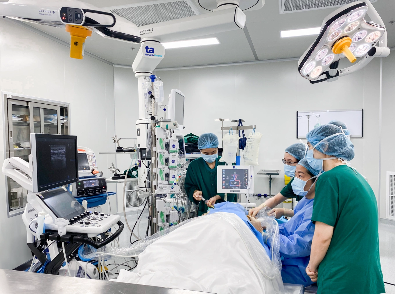 Dưới hướng dẫn của hình ảnh siêu âm, bác sĩ luồn ống thông đưa thuốc tê không chứa morphin vào khoang mặt phẳng cơ dựng sống bệnh nhân. Trong 4 tiếng, các bác sĩ phẫu thuật lấy một động mạch ở thành ngực và đoạn tĩnh mạch hiển ở cẳng chân, khâu nối tạo 4 cầu nối qua đoạn động mạch vành bị hẹp đưa máu đến nuôi tim. Sau phẫu thuật, bà Vân ngủ ngon, huyết áp ổn định, xuất viện sau ba ngày.